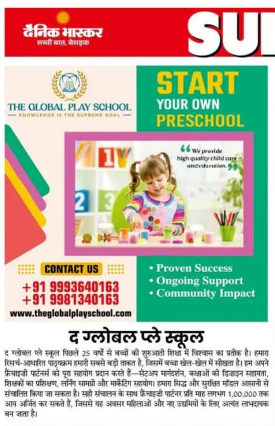 The Global Play School franchise is designed to be affordable and sustainable. With the right planning and support, franchise partners can earn an annual income of up to ₹10,00,000. This opportunity is especially beneficial for women entrepreneurs and new business owners who wish to start a meaningful venture in the education sector.